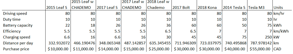 To really fill this in, I did some searching on Autotrader for electric cars (used and new) in the Toronto area. The table below lists my assumptions, as well as how far each virtual EV went in my virtual day and the price. Do note that these numbers are far from perfect, so do take it with a very healthy pinch of salt. Some adjustments were in order, for example, I decided to lower the charging speed of my 2018 Leaf w fast charging from the rated 50 kW to 30 kW to compensate for rapidgate (more on that in a later post).