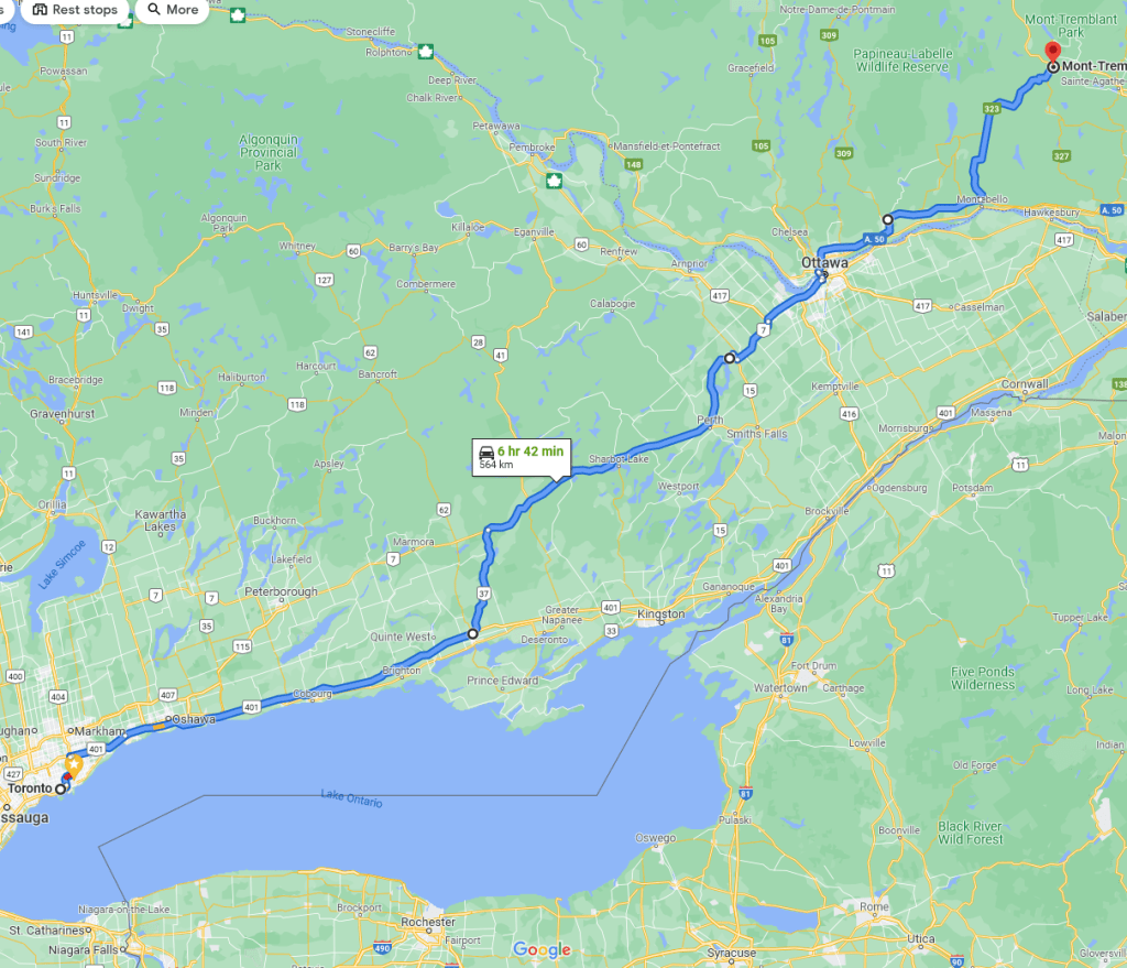 Leaving Bellville, we took hwy 37 to Hwy 7 and cruised along Hwy 7 to Carleton Place. A pair of Ivy chargers topped up our Leaf in Carleton Place as we fueled ourselves at a nearby Tim Hortons. This was enough to make it to Tremblant, but we were unsure of the charging situation at Tremblant having never been there. So plugshare guided us to a Flo L3 charger just out of Gatenau where we “filled up” the leaf. As it turned out, Tremblant has ample charging, and we found that our hotel (Sommet des Neges) even had a few chargers in the parking garage which we used to charge up the leaf for the return.