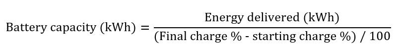 You will need the efficiency figure, which most EV’s will adjust to your driving style. Some models might have a number in the dash that you could use, but you can also use the efficiency column from my post on used EV’s. For example, for my 2018 Nissan Leaf, if the guess-o-meter says 217 km at 90% charge, and using 6.05 km/kWh we arrive at 217/(6.05 x 90 %) = 40 kWh. Even if there is an efficiency figure available in the dash, its often not the same as the one that is used by the EV’s guess-o-meter so this method, while simple, easy to do, and works in almost any EV, is not terribly accurate.