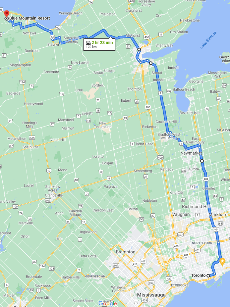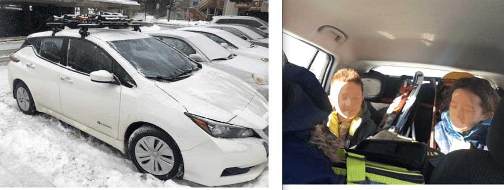 We decided to put the ski-rack on, which did reduce our range slightly (with the ski-rack, it was about 5 km/kWh, 5.5 km/kWh for the roof-box vs 6 km/kWh without the rack). A worthwhile tradeoff when you consider the increased space in the back. The range loss with the ski-rack is mostly aerodynamic in nature, so picking a slower route keeps those range losses to a minimum. With that in mind, we took Hwy 404 North out of Toronto then switched to Hwy 4 once we got North of Newmaket.