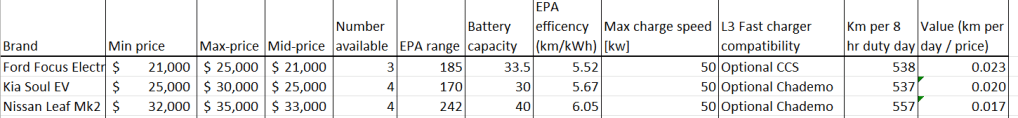 As you can see from the table above, selection was much more limited, with only 11 EV’s available for sale that met our criteria. As before, there were no Tesla’s that meet my criteria of a $35 000 minimum price, the cheapest being a 2014 Tesla Model S with 200 000 km on it, at $40 000. I suspect that will change as older Tesla’s start hitting the used car market in a few more years. A single 2019 Toyota Mirai hydrogen fuel cell car showed up on my search, as it was only a single car, it did not make my table (a minimum of three is required), but if you have $29 000, this unique vehicle could become yours. Do note that it is not an EV, and as far as I can tell, there are very few hydrogen fueling stations around, but a curious vehicle nevertheless. A pair of Mitsubishi MiEV’s, and a pair of first generation Nissan Leafs did appear on my search, but again as three are required, neither made my table. But some are out there, and these two make excellent budget cars.