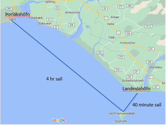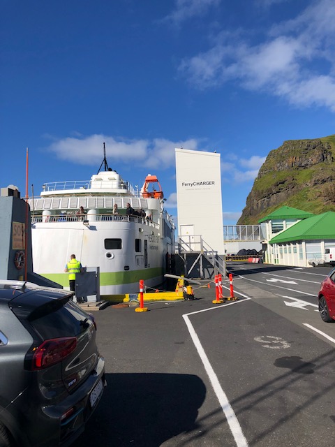 The ferry Herjólfur, operates from Landeyjahöfn to Vestmannaeyjar, usually a 40 minute sail. Staff tells me that usually this can be done on electricity alone, although there is an onboard Diesel generator that can be used once the batteries are empty. On occasion in the winter, weather can close Landeyjahöfn, in which case a longer 4 hour sail is needed to Þorlákshöfn.