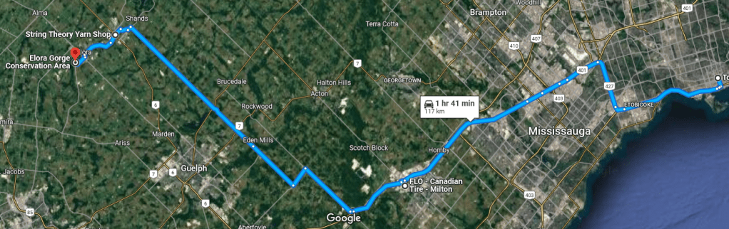 About 120 km North-West of Toronto sits Elora Gorge conservation area. During the summer, they offer tubing through the gorge, along the Grand River. What a fine way to get out of the house and enjoy nature in an active way. There is a campground at the conservation area if you prefer to stay overnight, but it is a short drive to home, so that is what we did, after studying some “string-theory” at a nearby yarn-store in Fergus ON.
