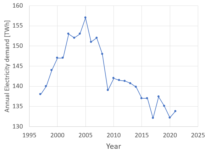 So, our hypothetical 256 B km per year for Ontario’s car fleet, would then consume about 52 TWh per year. What are we asking the grid to do here? In 2021, Ontario consumed about 134 TWh per year (see below), so if every car went electric, right this nanosecond! we can expect total demand to increase by about 40 %. If we are careful about when we charge, I think we might manage an EV transition of “right this nanosecond”. Somehow back in 2007, an all time record summer demand was 27 GW, compared to a 15 GW demand on a fall afternoon in 2022 (source), that’s a 55% difference, more than our 40% increase.