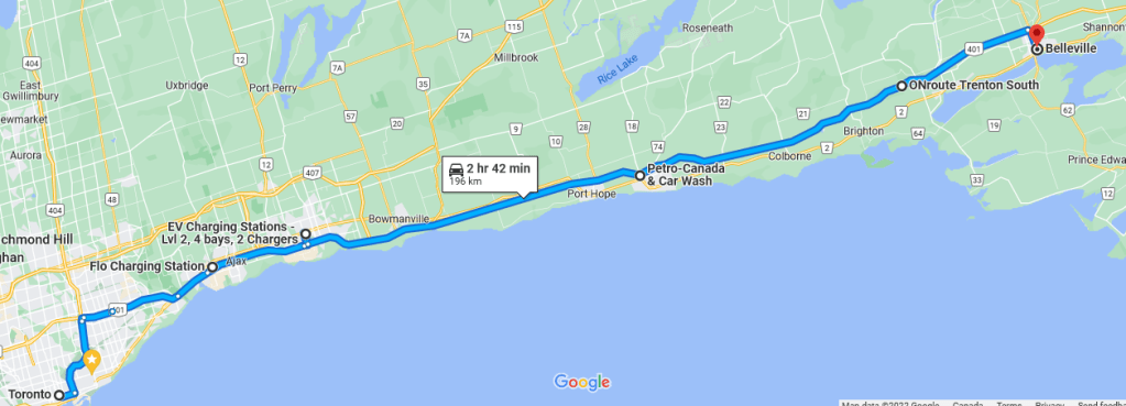As avid readers of this blog will note, roadtripping in an EV is entirely possible, and in my opinion a lot more fun than in a gas car. Further, charging availability, at least in certain corridors, is getting to a point where you have lots of options. Gone are the days where the distance to the next charger dictated your driving speed. Consider for example, the 190 km leg from Toronto to Bellville, ON. There are at least 4 DC fast charging stations I have used along the route, and plugshare shows a few more that I have not used.