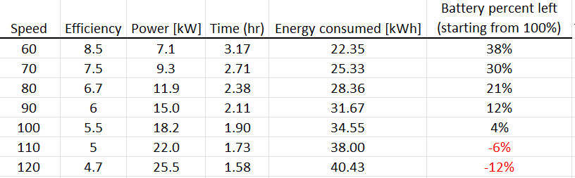In my 2018 Nissan Leaf, I could choose to stick to the speed limit, and make it with a few percent, left on the Battery, or start hauling, but stop to fast charge. The table below outlines what happens (theoretically) at several different speeds. The efficiency numbers I got from an earlier post, and some of my experiences on this blog.