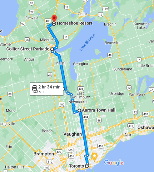 Situated a little north of Barrie, horseshoe resort is easily reached from Toronto, even in an older EV. Its quite a treat located only 120 km or so North of Toronto. There is ample charging along the way, I did this trip in my 2015 Nissan Leaf, so I stopped for coffee in Aurora, and a nice dinner at a craft brewery in Barrie. Horseshoe offers stay and ski packages, which make hitting the slopes super convenient. Should one tire of skiing, Horseshoe also has an excellent cross-country/snow shoeing park with lots of trails wandering through the nearby Copeland forest.