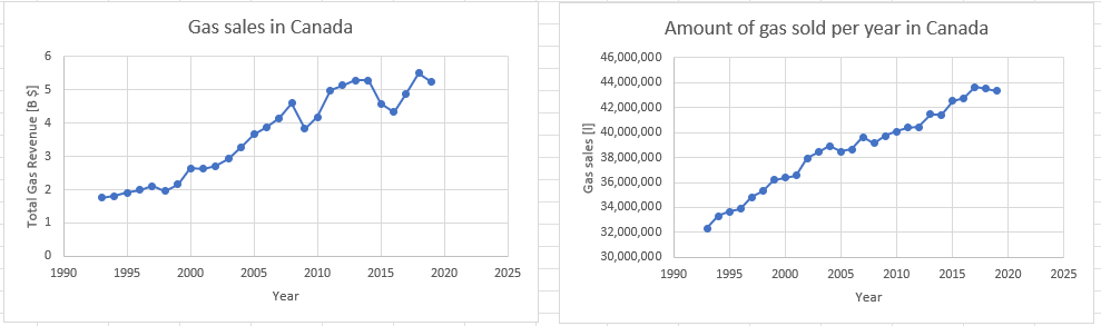 Looking at gasoline sales over the last 25 years or so does offer some hints of a “stalling-market”. Sales both in dollars and liters, climbed steadily since 1993, yet have leveled of around 2017 or so, and declined slightly since then. I did not include any data from 2020 and onwards, as the COVID pandemic undoubtedly caused much chaos is gasoline markets as everywhere else. While it is too early to tell, “peak-gas” appears to have been in 2018 (by value), or 2017 (by volume).