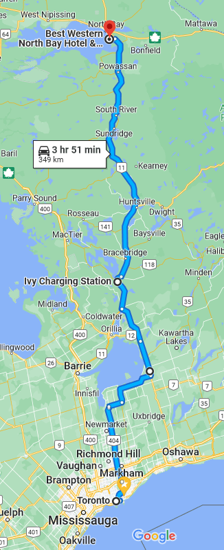 We did do the North Bay run in our 2015 Leaf as well. While the 350 km journey is a stretch for the 2015 Leaf, particularly as ours did not have fast charging, we did manage with an overnight stop in Orillia on the way up, and Arrowhead for some camping, on the way down.