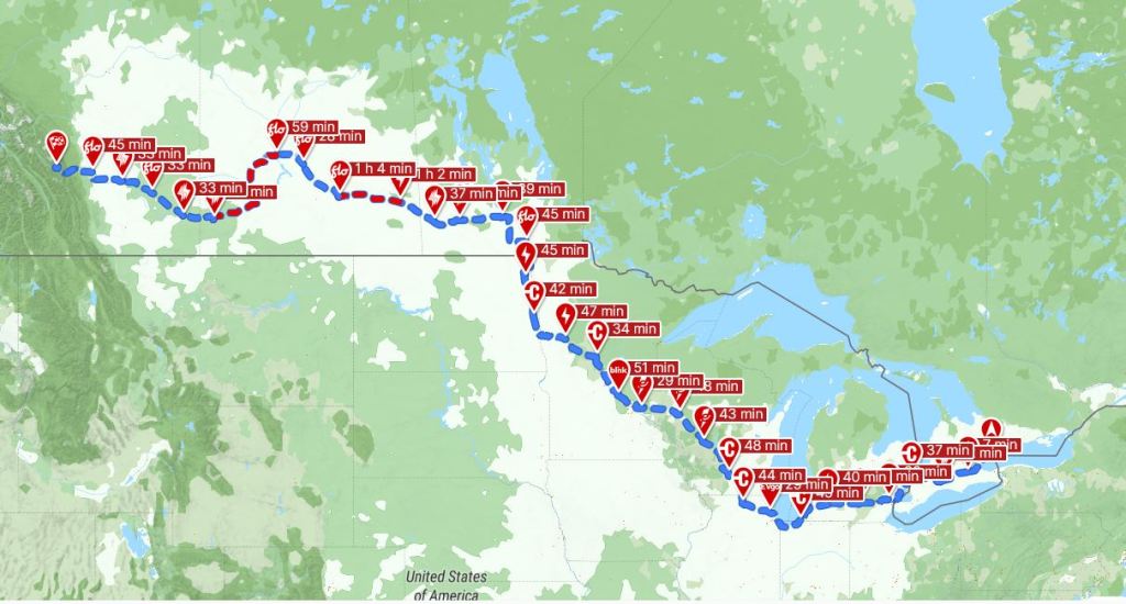Interestingly enough a better routeplanner (https://abetterrouteplanner.com/) does almost succeed in finding a 40 hour route for my 2018 Nissan Leaf from Toronto to Alberta. There are some routing issues while going through Saskatchewan, but I suspect with clever planning on where you spend the night (and charging overnight from a wall plug while you snooze), something could be managed. Perhaps it would be 4 days vs the 3 day reference journey.