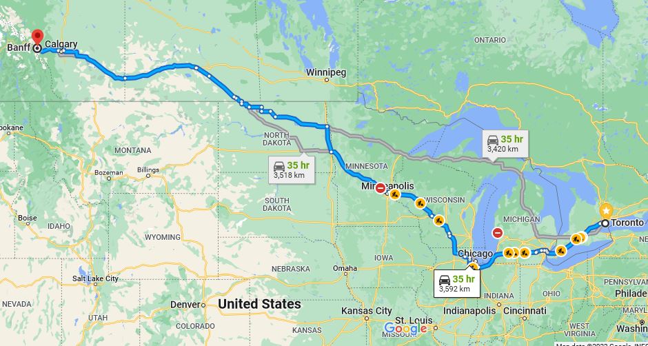 Even if one could drive nonstop to Banff, AB, it would take several days at least. Its over 3000 km! Driving non-stop with only the minimum in terms of customs delays (going through the US shaves a few hundred km of the journey), gets you a 35 hr drive time, hardly practical anyways. If you are a commercial truck driver, you are limited to no more than 14 hours driving in a day (source). Therefore, its a thee day odyssey even without charging stops.