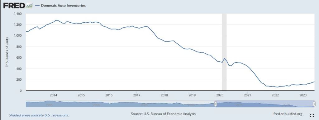 Looking back at inventory levels for the Auto industry (courtesy of the US Bureau of Economic Analysis), we find that inventory levels are at rock bottom, the trend pre-dates COVID. Inventory for all its uses, is a drain on company books. The last year or so has seen some recovery, but inventory levels have a long way to go in order to get back to pre-covid, and even post financial crisis levels.