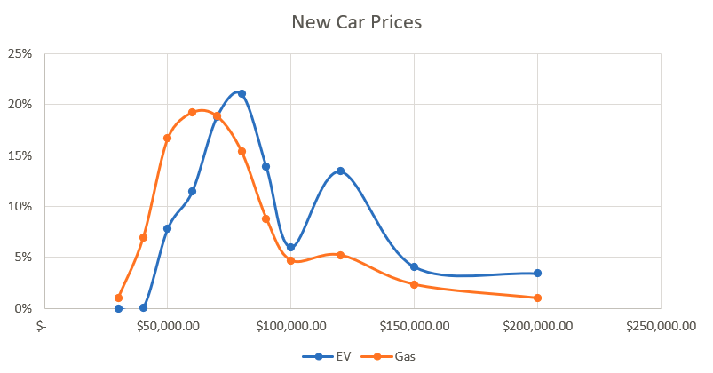 Interesting just how similar these curves are. Both have a “first-hump” around the $50-80k mark, with a second “hump” around the $125k mark. In both cases, there is no inventory at below the $20k mark, but you would need 10k more to see some inventory, with EVs being at $50k, and $40k for gas cars. The point, where 50% of inventory is below a price ceiling falls at is between $60k-$70k for gas cars, and $70k-$80k for EVs.