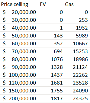 Methodology: We use autotrader.ca to count up all the new cars available within 100 km of Toronto,ON. We also apply a filter to select only electric cars to see how gas cars and EVs compare. We type in a price ceiling, which we vary from $20k to $200k. This gives us the following table.