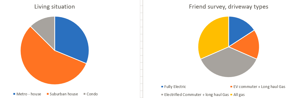 Not a very scientific venture by any means, but lets have a look at my de-identified friend group to see which of my friends have gone electric? We find significant uptake among suburban two car households, with one road-tripper, and one commuter car. If my friends are representative of society en large, there is still some distance to go in that market, but I’m starting to see the logic in all these electric crossovers that have been hitting the market.
