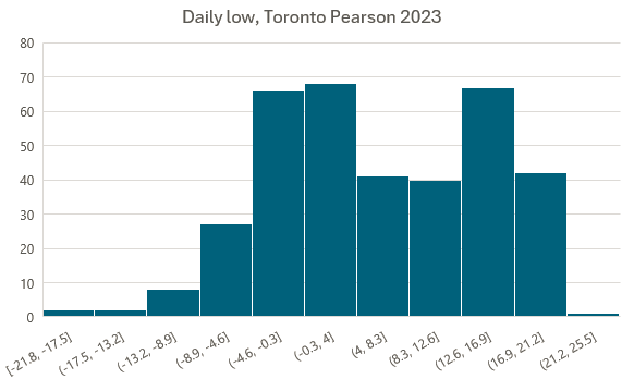 Lets start with the weather. How often does it get really cold in Toronto, ON? The Canadian government offers you the opportunity to peruse historical weather data (source), it seems as 2017 came to a close, the temperature bottomed out at -22 C. Looking at last year, 2023, the daily low got almost to -22 C, but interestingly enough, only 12 nights were cooler than -8.9 C, with about 39 nights cooler than -4.6 C. Hence if we choose a balance point cooler than -8.9 C, our heat-pump will operate at least 96.7% of the time. And if we opt for -4.6C, our heat-pump operates 89% of the time. Thus picking something cooler than -5C keeps the heat-pump firmly in charge of our house heating.
