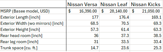 What is a good comparable gas car? Well, looking at the excellent Edmonds I found the Nissan Versa and the Nissan Kicks, that seemed to offer similar dimensions. Granted, I might be obsessed about the rear seat owning to my growing teenagers, but lets see how these two compare (plus the Leaf).