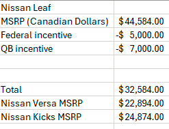 How do things look north of the border. Well, the Canadian federal government offers a 5000$ CAD rebate (source), Quebec offers 7000 $ CAD (source), BC offers a less generous 4000$ CAD rebate (source). Lets pick Quebec and see what we get (pricing from nissan.ca):