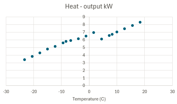 Recall from our previous post the coefficient of performance reduces as the temperature outside gets colder. Thus, the amount of heat we get from the heat-pump as it gets colder, as shown in the graph below for my Daikin heat-pump, thus, my heat-pumps ability to warm up the house is reduced as it gets colder. This is also the main argument for having a backup-heat system in Toronto’s climate, as we do have a few days every year where it gets to -20 C (see this post).