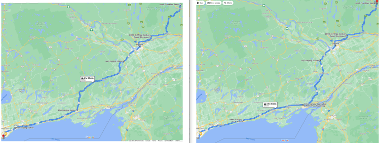 Lets start by looking at how the trip with the fan compares to my previous trips. Over the years, we have mostly stuck with the Toronto->Belleville->Carleton Place -> Tremblant route, although we have tried Toronto->Kingston->Carleton Place->Tremblant, which is slightly longer but avoids the charging desert between Belleville and Carleton Place. See image below for the route options.