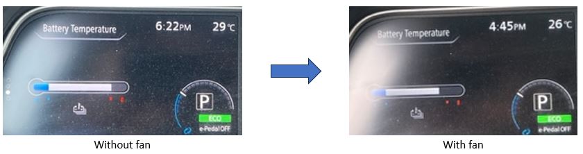So, I do feel the fan helps a bit, we stayed out of the “hot-zone”, thus confirming our earlier result shown below that with the fan we do keep the pack a little bit cooler.