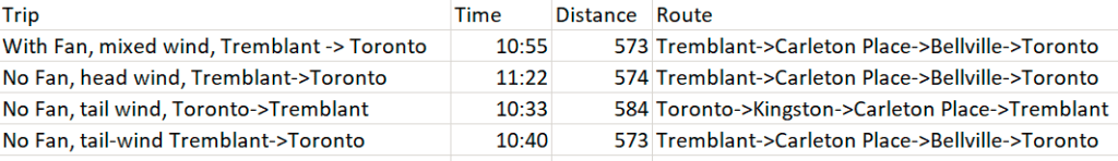 As we can see from the table below, head or tail wind seems to be more important than weather we use the fan or not. I suppose we could have been a little more efficient, we charged up to 95% in Bellville on the way home, which might have gotten us to Toronto, but the kids got hungry and we had to do a burger stop in Bowmanville. Had we skipped that, we might have saved 10 minutes of our trip time, coming close to the 10:33 record we got with more favourable tail-wind on the Kingston route.