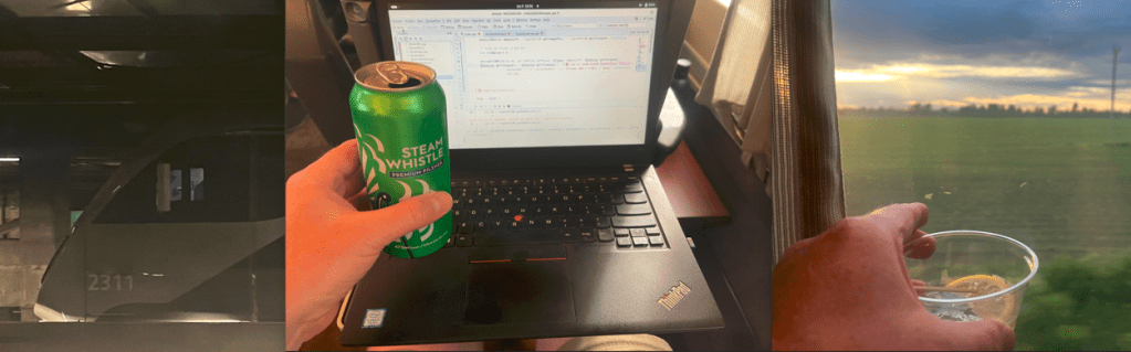 What got me onboard the train, was mostly how to get back from Montreal. Our sporting event ended at 4 pm. Assuming an hour to get out of the event area, the train got us home by midnight, flying might have gotten us home a little sooner, but the leaf would have meant a 3 am arrival, a gas car would have been slightly faster at perhaps a 2 am arrival. Driving it seams, would have made the Monday morning task of waking up the teenagers even harder.