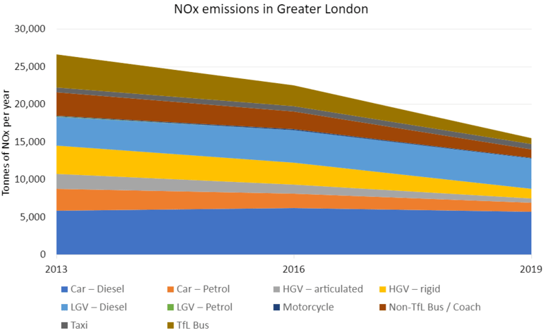 Proponents have largely pointed to reductions of pollutants over the 20 year history of the program, shown below for nitrous oxides in greather london. As you can see, the proportion coming from transport for London’s (TFL) buses has reduced dramatically, while that from private Diesel cars has stayed, suggesting that a low emissions charge might tip the scales to improve air polution.