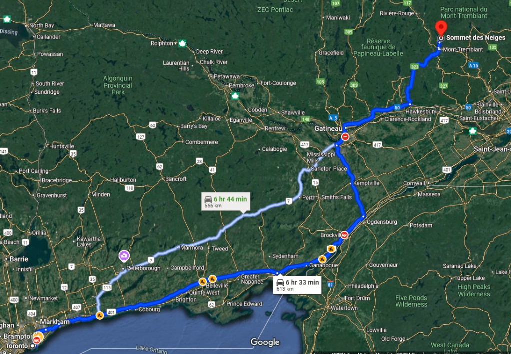 There is also the issue of the charging curve, namely that EVs generally charge quite quickly to 50-80%, where the charging slows down dramatically after that. Hence at our lone charging stop, we most likely would need to charge our EV to nearly 100% to make it to Tremblant. But yes, a one stop to Tremblant is certainly doable.