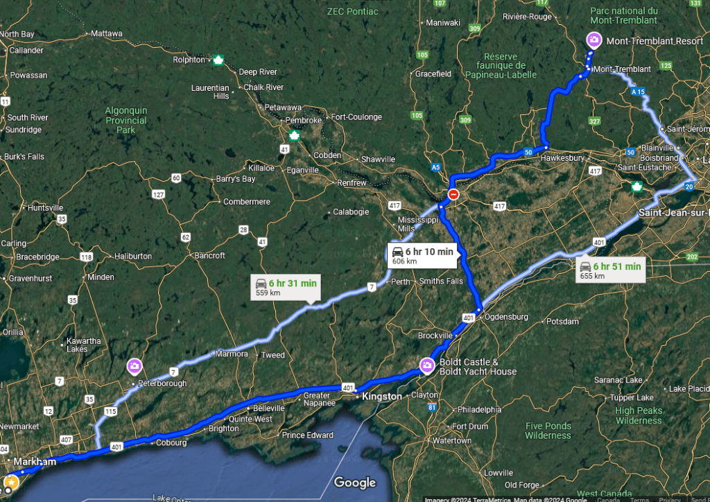 We begin with a re-cap, the route from Toronto to Mnt. Tremblant is about 550-600 km, depending on the route chosen. Breifly, all routes go through Ottawa, but there is some fauna as to how to get to Ottawa. There is Hwy 7 via Peterbourogh and Carleton Place, then there is the 401-416. The 401-416 is faster with better charging, but longer. Then we have some hybrid approaches, say take the 401 to Bellville, then switch to hw7, or take the 401 to Kingston, then go North through Smith’s Falls.