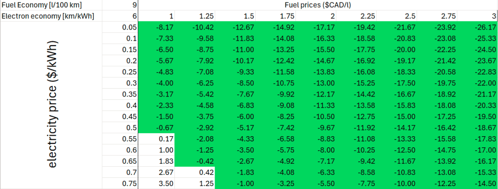 Confused yet? Well, perhaps its time for some math. Lets start by comparing our average 6km/kWh EV (say the Nissan Leaf (source)), with an average gas car at 26 miles to the gallon (source). We compute the cost of driving 100 km in the EV and subtract the cost of the same 100 km drive in the gas-car. A big positive number, means that we spent a lot on electrons and not on gas, while a large negative number means we got cheap electrons, but spent heavily on gas. So lets colour the negative values green, as that means we spend more on gas than electrons, making the EV cheaper.