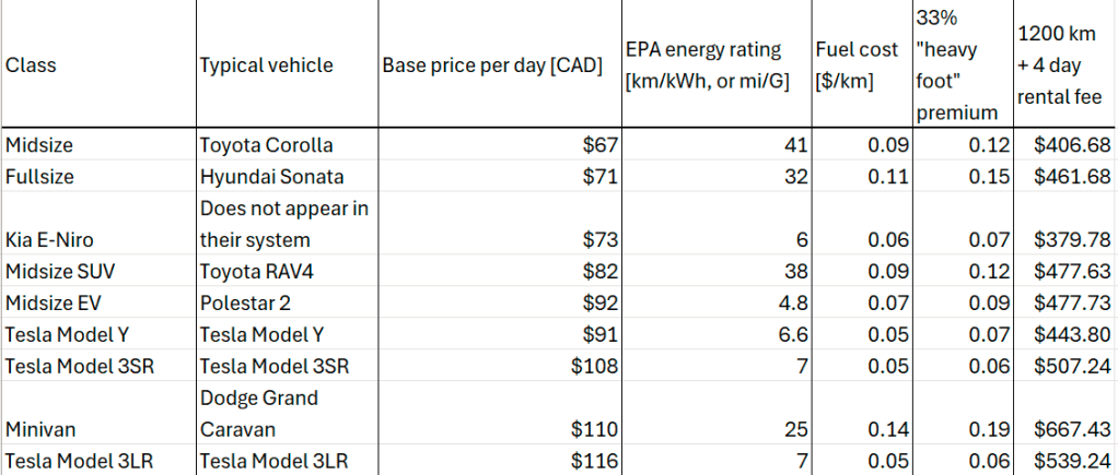 As we can see, the EVs generally have lower fuel cost per km. The Dodge Caravan takes the cake as the most expensive per km rental, at 14c/km, and the Tesla’s are the cheapest at 5c/km. Now, much depends on how far you intend to drive. For shorter distances, even the costlier kilometres of the Midsize might be preferable, as the base price is much lower, while for longer drives, the base fee will be small compared to the per km fuel cost. I did promise a “heavy-footed”, scaling factor, which we add to the table. We found that we got 4.5 km/kWh instead of the promissed 6 km/kWh, mostly as we drove faster than the 80km/hr or so the EPA test cycle uses. So, we bump the per km cost up for all vehicles by that 33%, and compute the total for a 1200 km drive, 4 day rental.