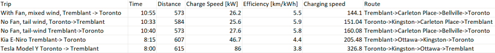 To be fair, the conditions in our Model Y run were quite a bit worse compared to our earlier E-Niro run. It was considerably colder (-10 to -20 C, vs 0 to -10 C), and winter weather made for delays owning to snow removal operations. I suspect the E-Niro would not have made the Tremblant run in 8hrs and 15 minutes under these conditions. Also, my wife recons I should have given the Model Y a “20 minute bonus”, as we did get stuck behind a snow-plow during snow-removal. But that slower driving has a silver lining, as that does improve efficiency, to about 4.2 km/kWh, not enough to catch the E-Niro but it does close the gap, so Ill keep my statistics real.