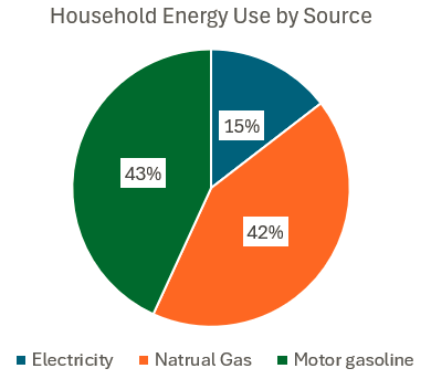 Lets start by charting our average household, and looking at in terms of both electrical energy, and how much energy is released when gas is burned in cars, or natural gas in our furnaces (source, source and source). Interestingly, electricity is only about 15% of the total. But then again, while we do want heat when we burn natural gas in the winter-time, we just want it inside our house, further heat is not the desired outcome when we burn gasoline in our cars, we want to get to where we want to go.