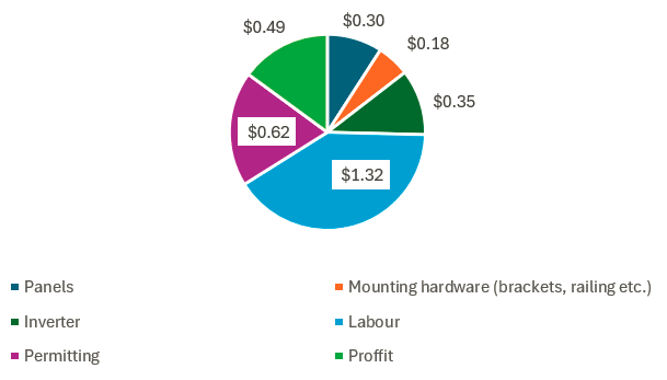 Hardware cost (mounting/panels/inverter) came from frankensolar.ca, permitting was estimated by reviewing my first deposit invoice, and adding a small allowance for a permit from the electrical safety authority (ESA), for electrical work (that is usually obtained later). Labour was trickier to estimate, some chatting with the solar crew revealed that they were often former roofers, and it so happens that my roofing invoices were split, payment for materials was separate from labour, which allowed me to estimate labour expenses. While roofing is very different from solar panel installation, I found the two jobs both required about 7 man-days of work each, suggesting similar labour costs between the two.