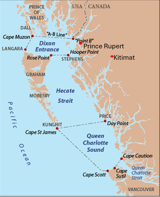 There is also the matter of the British Columbia Tanker moratorium, as shown on the map below, its hard to sail a Tanker to either Prince Rupert, BC or Kitimat, BC without having to go through waters included in the BC tanker moratorium.