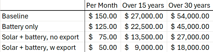 Briefly, for us, the power-bill is about $150 a month, as we saw, our solar and battery system can cut that in half to say $75 a month, while exporting would likely trim that further to say $50. Further, we have had a few months, where only the battery was installed, in our experience, the peak charges are covered by the battery, as well as some of the daytime usage. Hence, we wind up with a power bill of around $125 per month. Doing the math, we arrive at the following figures.