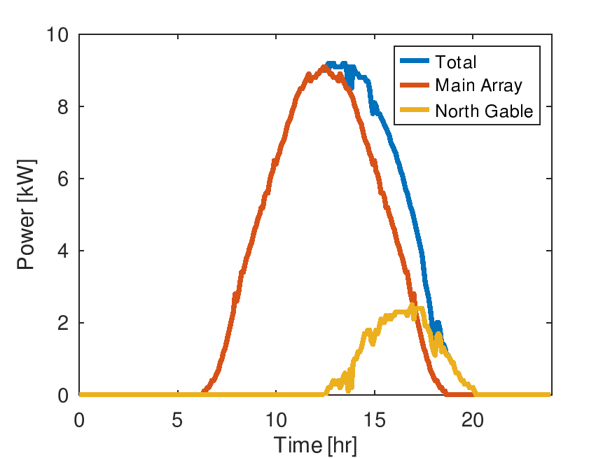 Thinking about going solar? Confused by the terminology? Wondering if it will all pay for itself?In that case, welcome, lets discuss these basic design terms, and use real-data from my solar array to add depth to our discussion. Briefly, I have 28, 405 W panels, with 22 located on the south facing gable of my main roof, while the other 6 are on the North Facing gable. In effect, I have two-sub-arrays which then add. But they do so in interesting ways, as the sun rises, the incident angle onto my solar array becomes more favourable, reaching a peak around lunch-time, before falling in the afternoon.
