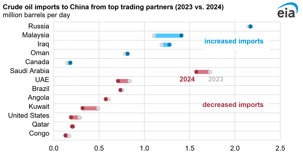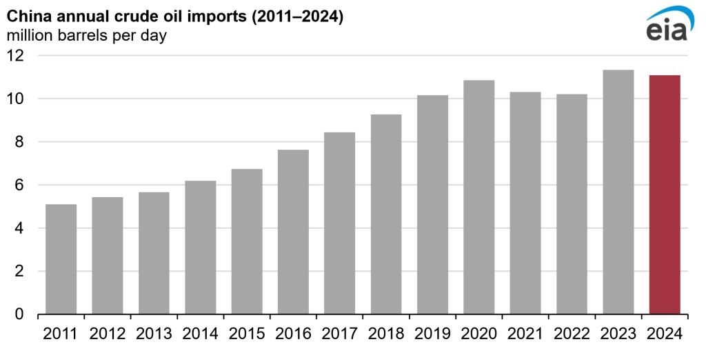 According the US energy information administration, China’s oil imports have been plateoing since the pandemic, while 2023 was a record year, oil imports into China have not increased all that much since 2019 (10 MBpd in 2019 to 11.1 MBpd in 2024, about 10% growth in 5 years). Two forecasters predict this will continue into the 2030’s with sluggish if any growth in China’s oil imports (source and source).