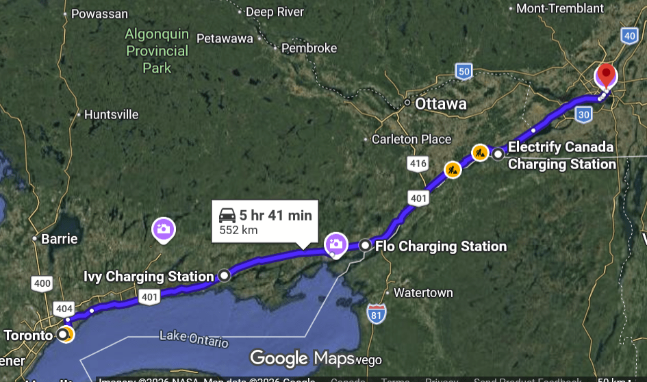As avid readers of this blog might have noticed, I have not done a trip report in a while. Mostly because motorway travel in an EV is not really an issue these days. New EVs can easilly cover 300 km without charging, and once at a charging station one charges up before the driver enjoys a burger or goes to the bathroom, not both, as 20-30 minute charging stops have become the norm. Even in an older EV, such as my trusty 2018 Nissan Leaf, motorway travel is quite possible as this blog will certainly attest to, I have gone to Timmins, Ottawa and Windsor just to name a few. However, I felt there was a Montreal sized hole, in my trip reports and thus I decided to fill it.